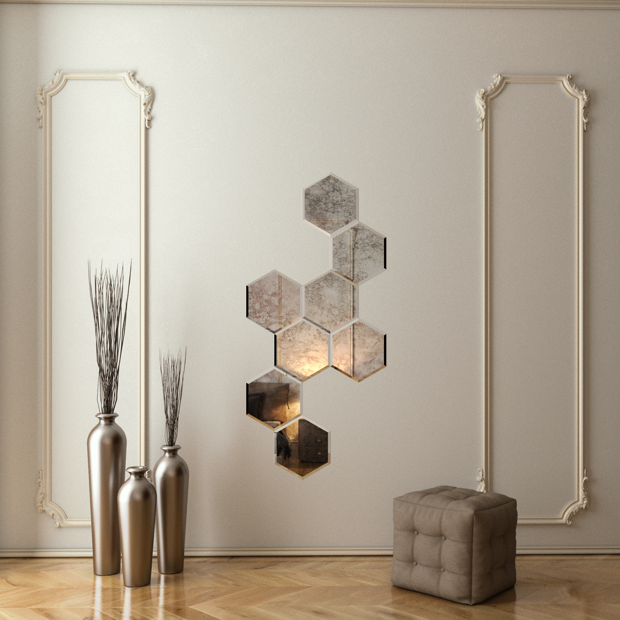 Aceasta este o propunere unica pentru persoanele care apreciaza libertatea in crearea interiorului. Pot fi montate in orice configuratie pe perete conform sugestiilor de prezentare sau orice alta combinatie dorita. Se incadreaza in interiorul original, concentrandu-se pe solutii indraznete, neobisnuite si stil modern. Oglinda hexagonala va arata bine inconjurata de alte forme geometrice. Hexagonurile sunt potrivite nu numai pentru un stil modern, ci pot fi si ele un accent revigorant in ceea ce priveste aspectul unei bai sau o adaugare interesanta a interioarelor mai traditionale. Ele pot fi lipite pe orice suprafata curata si uniforma.