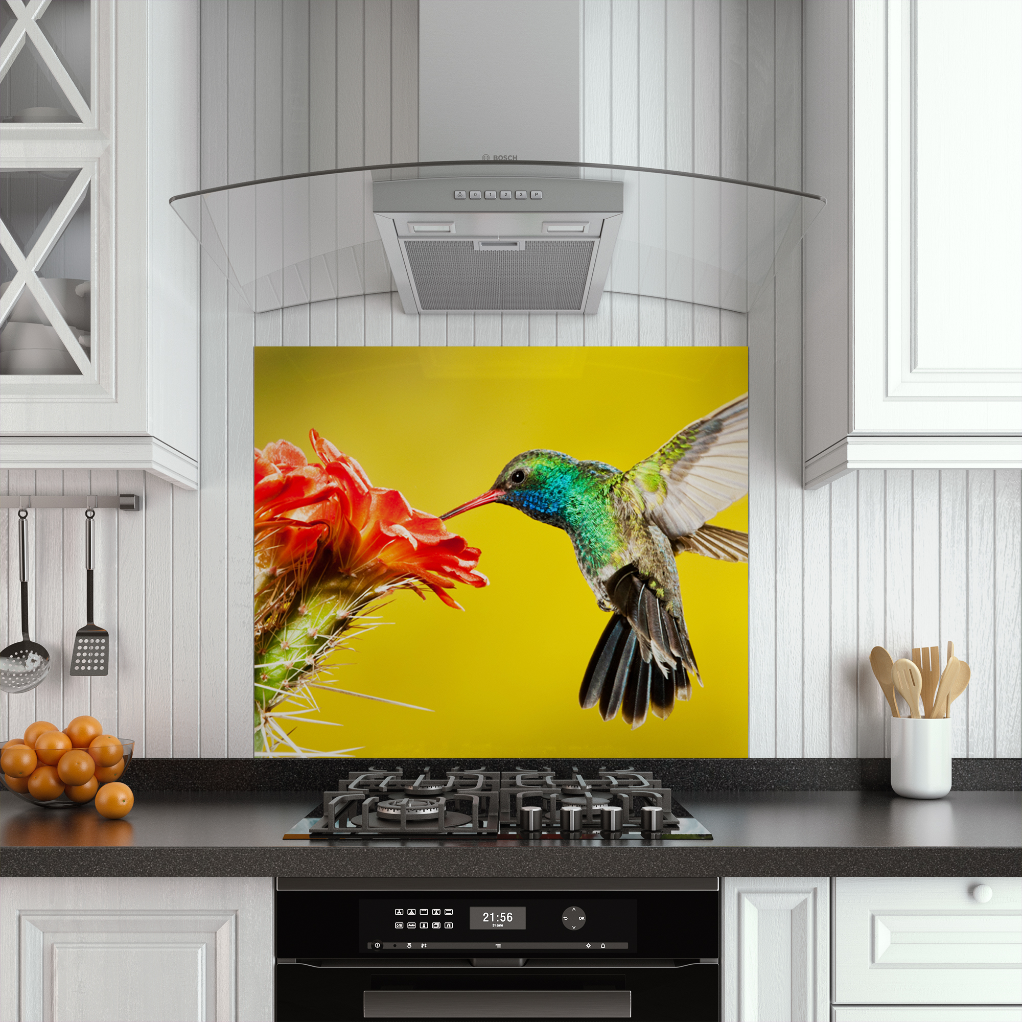 Panoul este destinat a fi lipit pe peretele din spatele plitei și este compus din sticlă Diamant sau Float, grosime 4 sau 6 mm, securizată, prelucrată pe muchie și printată cu modelul prezentat.