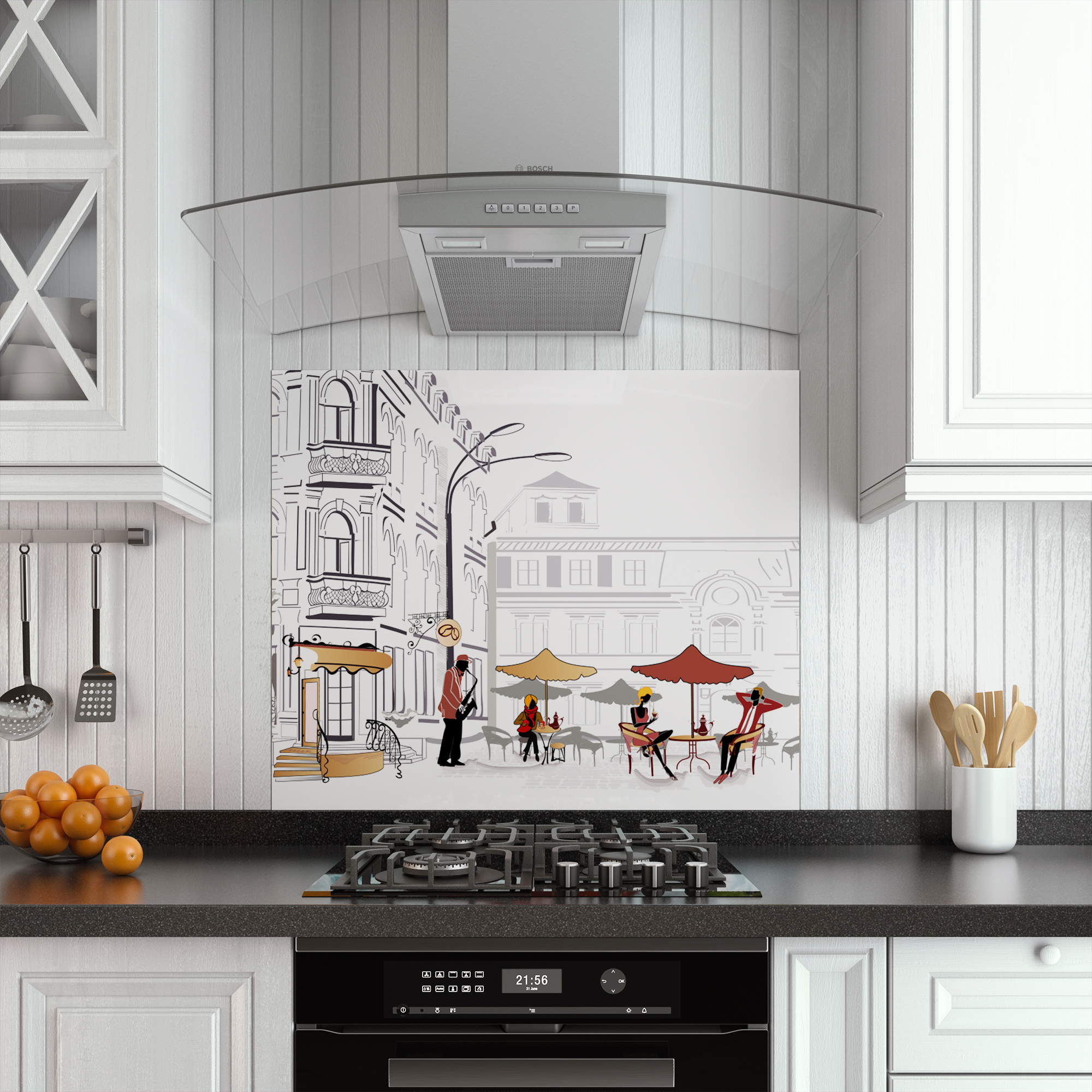 Panoul este destinat a fi lipit pe peretele din spatele plitei și este compus din sticlă Diamant sau Float, grosime 4 sau 6 mm, securizată, prelucrată pe muchie și printată cu modelul prezentat.